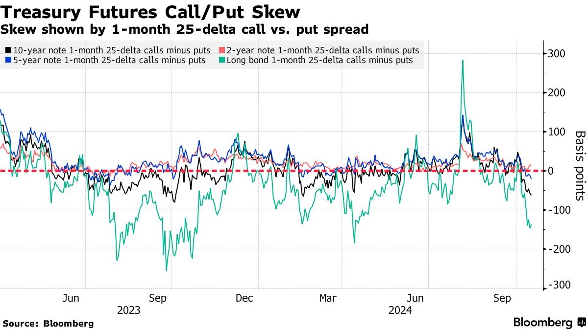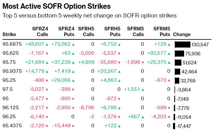 过去一周SOFR期权未平仓合约的最大变动包括12月24日看跌期权95.6875和95.75的涨幅,此前近期有大量买入SFRZ4 95.75/95.6875/95.625/95.5625看跌期权,而SFRZ4 95.8125/95.6875 1x2看跌期权价差也被大量买入。