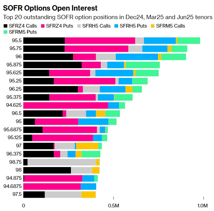 在截至2025年6月的SOFR期权中,就未平仓合约而言,95.50期权仍然是持仓最多的期权,在12月24日的看涨期权和看跌期权以及3月25日的看跌期权中都持有特定数量的风险。最近在95.75执行价附近的交易活动有所增加,这是继最近的资金流动(包括SFRZ4 95.75/95.6875/95.625/95.5625看跌鹰式策略)之后第二多的交易活动。