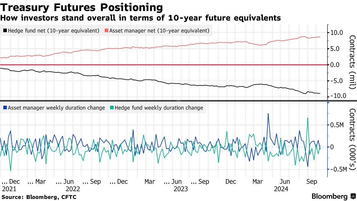 CFTC数据显示,在截至10月8日的一周内,杠杆基金对约3.8万份10年期美国国债期货的净空头仓位进行了回补。与此同时,资产管理公司同期平仓了约5.7万个10年期美国国债期货,转为净多头头寸。