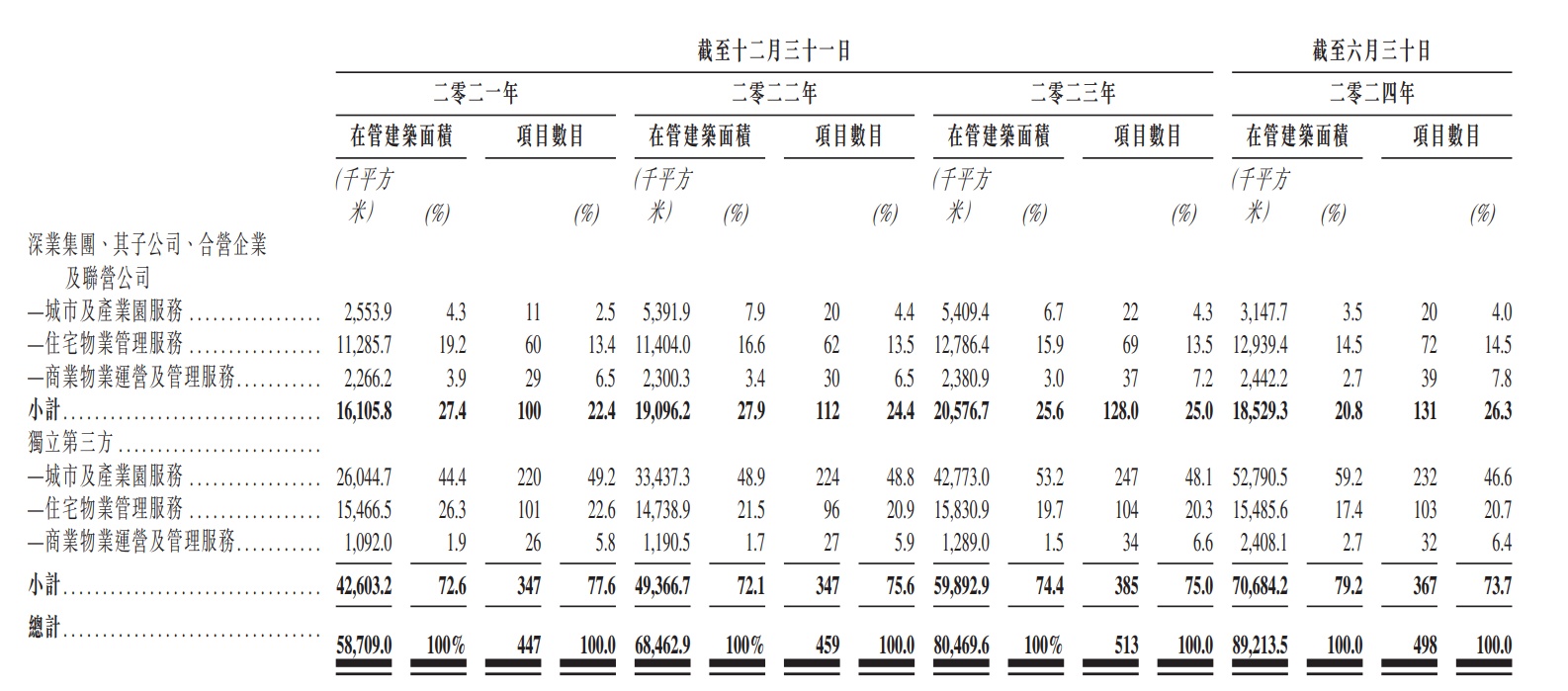 此外,深业物业的业务分为以下三个业务部门:城市及产业园服务、住宅物业管理服务、商业物业运营及管理服务。下表为按分部划分的在管建筑面积及项目数目: