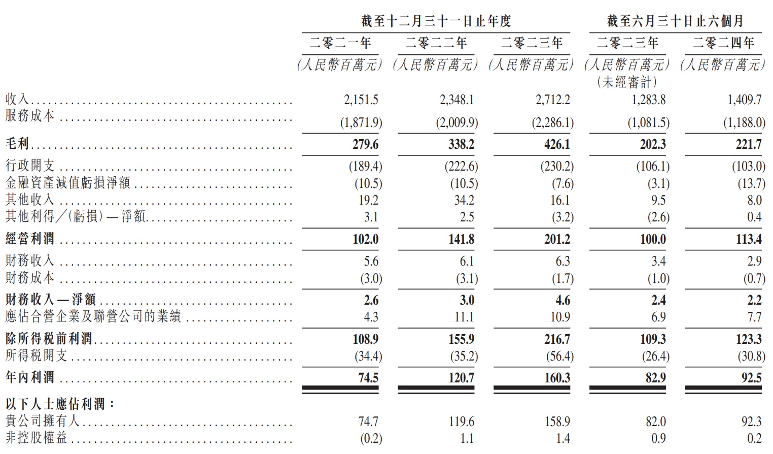 财务方面,于2021年度、2022年度、2023年、2024年截至6月30日止6个月,深业物业实现营业收入分别约为21.52亿元人民币(下同)、23.48亿元、27.12亿元、14.10亿元。同期,公司实现净利润分别约为0.75亿元、1.21亿元、1.60亿元、0.93亿元。