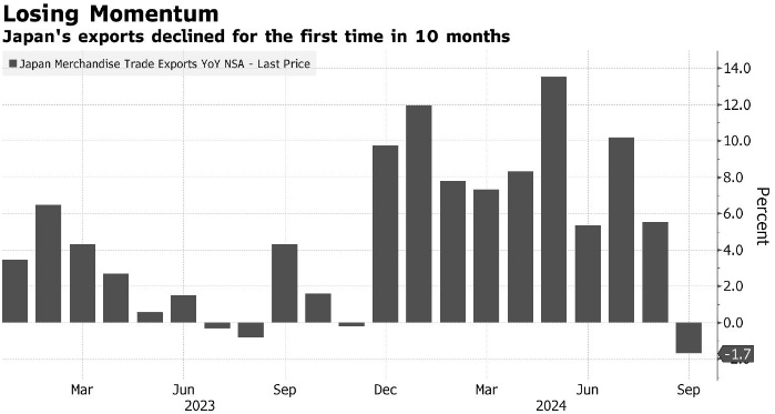 出口疲软反映出全球经济增长乏力,主要经济体前景的不确定性日益增加,尤其是那些央行已开始降息以避免经济进一步放缓的国家。上个月,美联储宣布降息50个百分点以维持经济,此前欧洲央行也做出了类似的决定,预计欧洲央行将在周四的会议上再次降息。日本对美国和欧洲的出口分别下降2.4%和9%。
