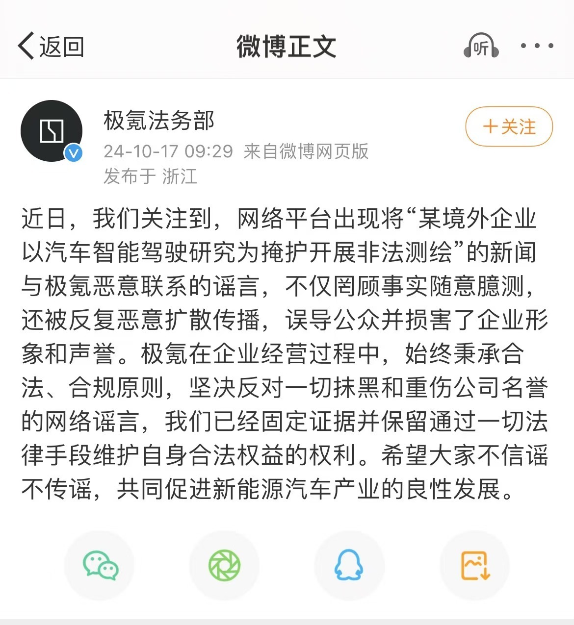 智通财经APP获悉,10月17日,极氪(ZK.US)法务部官方微博发布声明称,关注到网络平台出现将“某境外企业以汽车智能驾驶研究为掩护开展非法测绘”的新闻与极氪恶意联系的谣言,误导公众并损害了企业形象和声誉。极氪在企业经营过程中,始终秉承合法、合规原则,坚决反对一切抹黑和重伤公司名誉的网络谣言。该公司表示,已经固定证据并保留通过一切法律手段维护自身合法权益的权利。