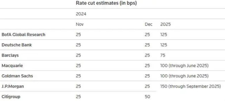 在近期的报告中,巴克莱、麦格理和德意志银行便也已均重申了,对美联储会在11月和12月分别降息25个基点的基准预期。在对年底的展望中,也只有花旗认为美联储12月会议或将再度降息50个基点,其他投行则均预计12月会议的降息幅度仍将为25个基点。
