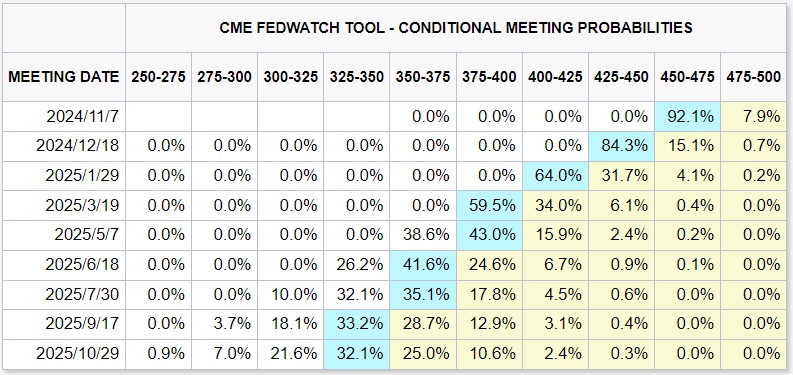 智通财经获悉,高盛周三表示,预计美联储将在2024年11月至2025年6月期间每次会议连续降息25个基点,最终利率区间为3.25-3.5%。上个月,美联储将隔夜利率下调了50个基点,理由是对通胀将继续回落至2%的年度目标的信心增强。隔夜利率目前在4.75%-5.00%之间,这一利率指导着银行间支付的利率,并影响着消费者的利率。根据CME美联储观察工具,市场目前预计美联储下次会议降息25个基点的可能性为92.1%,维持利率不变的可能性仅为7.9%。