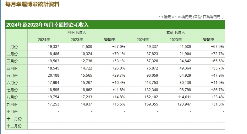 智通财经APP获悉,根据澳门博彩监察协调局数据显示,第三季度澳门幸运博彩毛收入共计556.02亿澳门元,同比上升14%,按季跌1.4%。1-9月,博彩累计毛收入为1693.55亿澳门元,同比升31.3%。