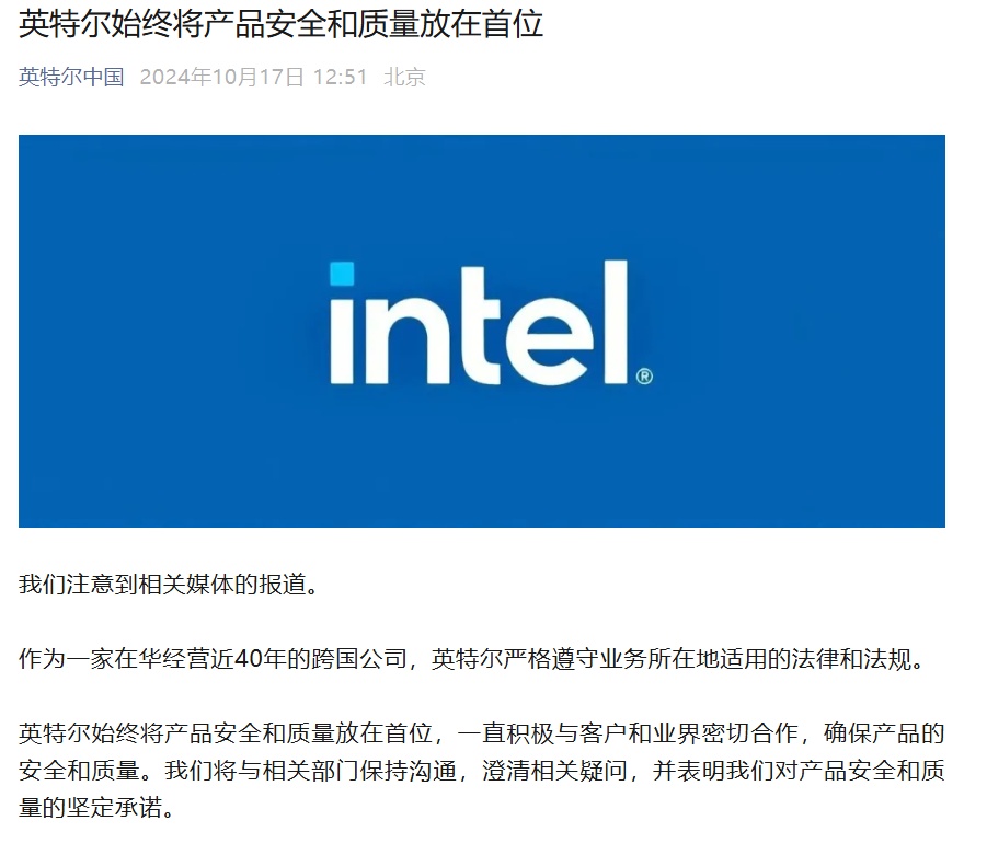 英特尔中国表示,英特尔始终将产品安全和质量放在首位,一直积极与客户和业界密切合作,确保产品的安全和质量。“我们将与相关部门保持沟通,澄清相关疑问,并表明我们对产品安全和质量的坚定承诺。”英特尔中国通过其微信公众号发文表示。