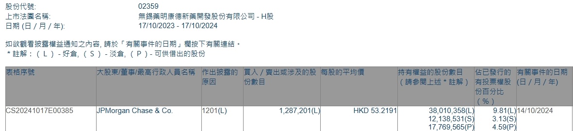 智通财经APP获悉,香港联交所最新资料显示,10月14日,摩根大通减持药明康德(02359)128.7201万股,每股作价为53.2191港元,总金额约为6850.37万港元。减持后最新持股数目约为3801.04万股,持股比例为9.81%。