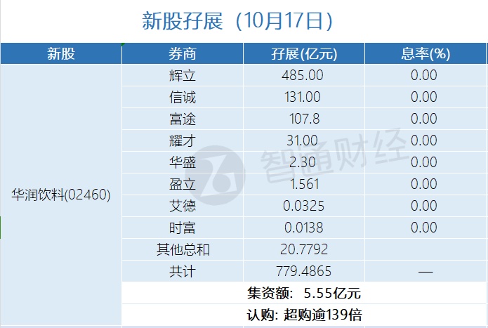 智通财经APP获悉,华润饮料(02460)正在招股中。截止10月17日,富途、辉立、耀才等券商合计为华润饮料借出779.4865亿港元,超购逾139倍。