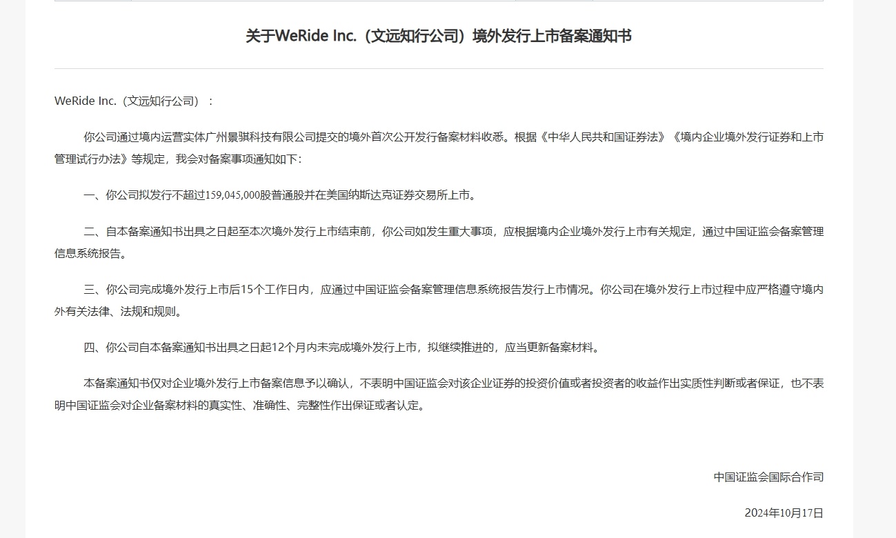 智通财经APP或获悉,10月17日,中国证监会发布关于WeRide Inc.(文远知行公司)境外发行上市备案通知书。其中提到,文远知行公司拟发行不超过159,045,000股普通股并在美国纳斯达克证券交易所上市,公司完成境外发行上市后15个工作日内,应通过中国证监会备案管理信息系统报告发行上市情况。自本备案通知书出具之日起12个月内未完成境外发行上市,拟继续推进的,应当更新备案材料。