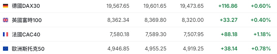 2. 截至发稿,德国DAX指数涨0.60%,英国富时100指数涨0.40%,法国CAC40指数涨1.18%,欧洲斯托克50指数涨0.78%。