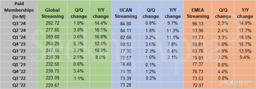 奈飞的新用户几乎全部来自欧洲、中东和非洲以及亚太地区。奈飞自2023年初以来首次在拉丁美洲失去客户。该公司还表示,第四季度的新用户数量将超过第三季度。