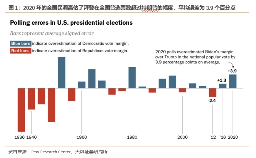 因此,2020年选举结束后,美国公共舆论研究协会对选举民调进行了复审,发现在2016年和2020年特朗普成为候选人时,全国民调的误差较大。其中,2020年总统选举是近40年来全国民调误差最大的一次,高估了拜登全国选举支持率领先特朗普的幅度达到了3.9个百分点。