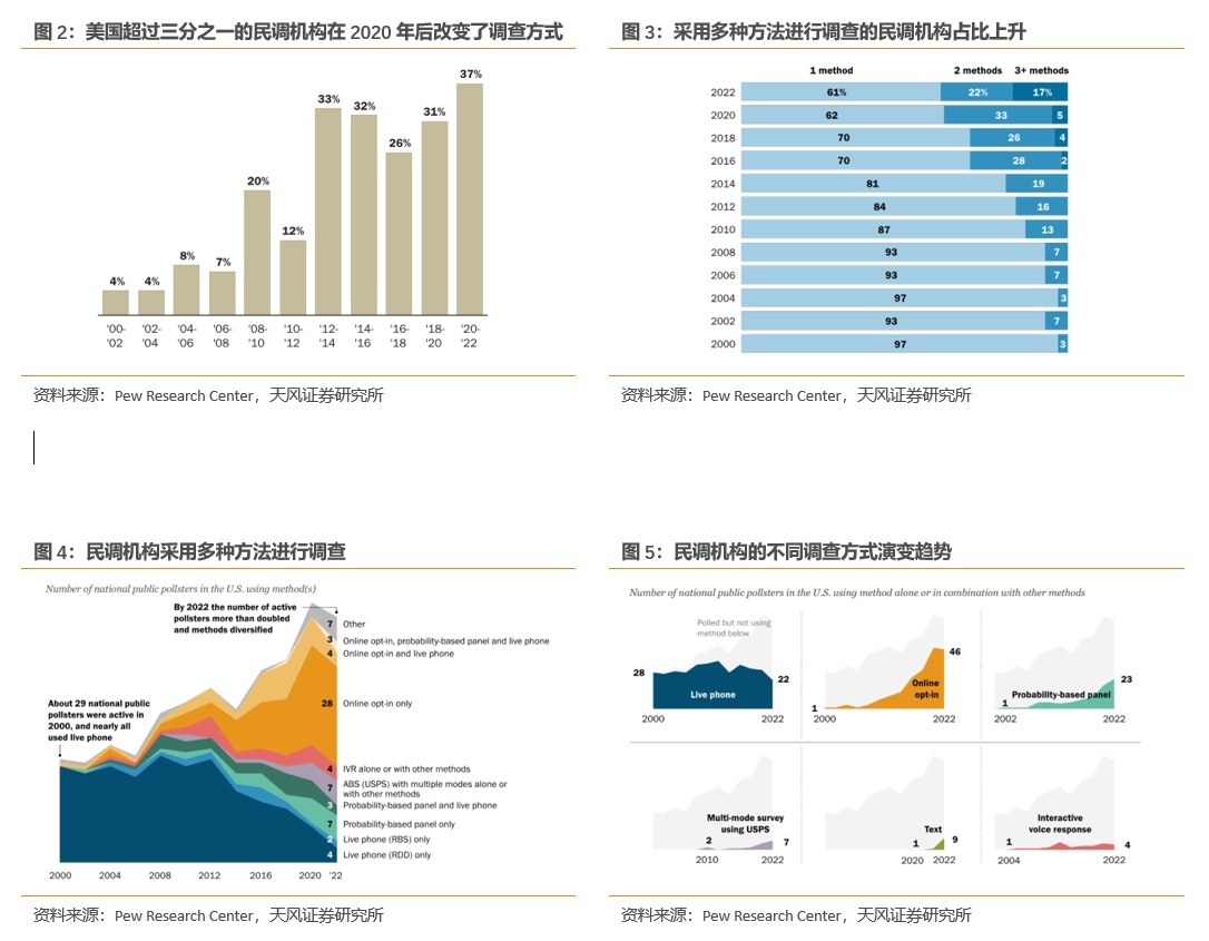 近年来民调机构使用的抽样方法越来越多,2022年39%的民调机构使用两种以上抽样方法,17%的民调机构采用三种以上方法。以Pew Research Center为例,该机构在2014年前仅依赖随机拨号电话采访,之后引入了基于概率抽样的访谈和基于地址抽样的在线或邮件访谈。