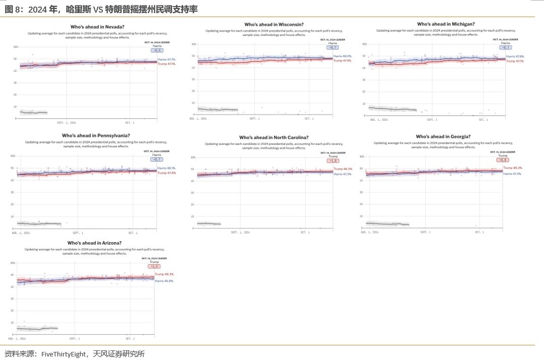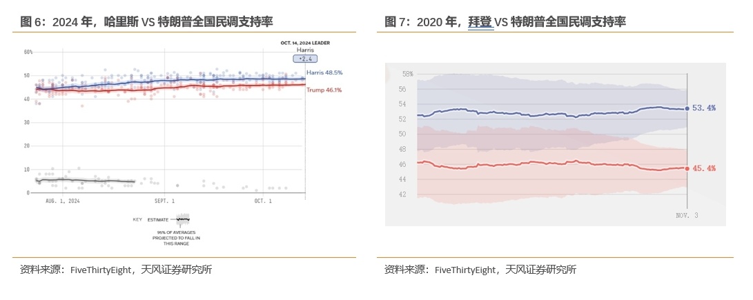 根据FiveThirtyEight,2020年拜登的全国民调支持率为53.4%,比特朗普高8个百分点,但结果也仅仅是险胜。截至2024年10月14日,哈里斯在全国范围内的民调支持率达到了48.5%,超过了特朗普的46.1%,但是领先幅度远小于拜登入主白宫的2020年。而从七大关键摇摆州的民调来看,哈里斯对特朗普并没有领先优势,这让本就偏向于民主党候选人的民调结果事实上更加支持特朗普当选。至少目前为止,大选整体还是处于难分胜负的胶着状态。