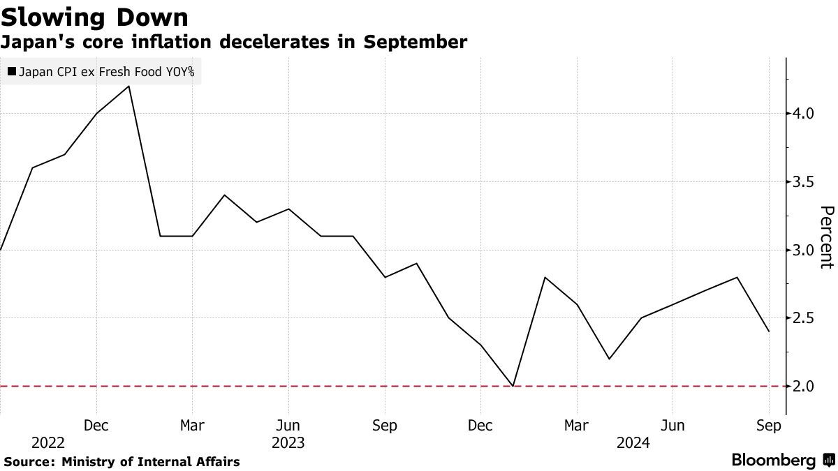 智通财经APP获悉,日本主要通胀指标在9月出现五个月以来的首次放缓。日本内务省周五公布的数据显示,不包括新鲜食品在内的日本9月全国核心CPI同比上涨2.4%,低于前值2.8%,但略高于市场预期的2.3%;日本9月全国CPI同比上涨2.5%,低于前值3%。