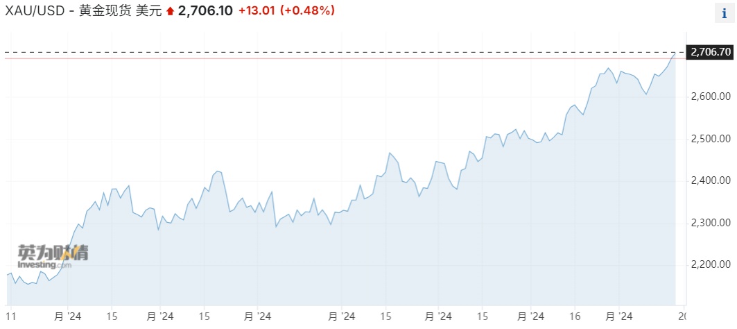智通财经获悉,现货黄金价格首次突破每盎司2700美元,因对中东冲突升级的担忧促使投资者涌向避险资产。周五,金价一度上涨0.5%,至2706.81美元/盎司,此前以色列称击毙了哈马斯领导人辛瓦尔(Yahya Sinwar)。辛瓦尔策划了哈马斯对以色列南部的袭击,引发了长达一年的加沙战争。