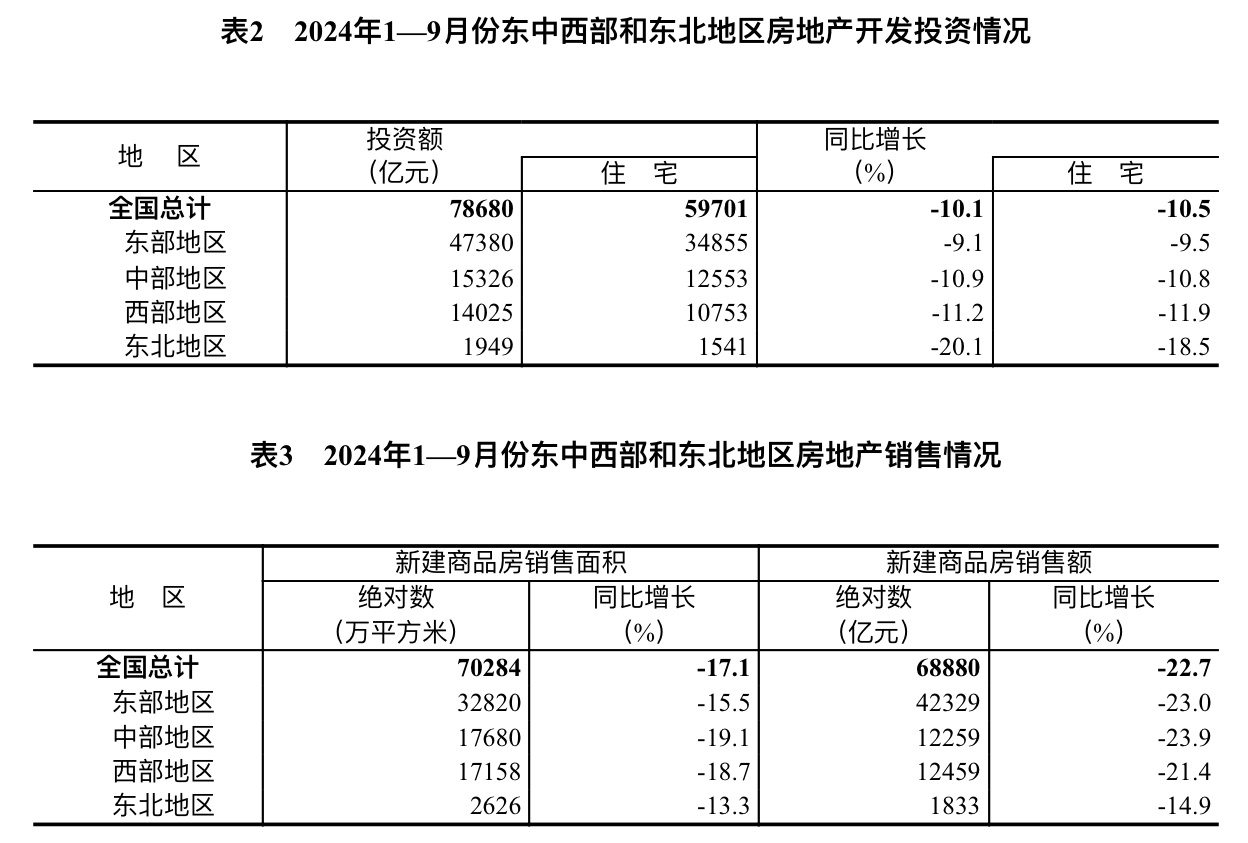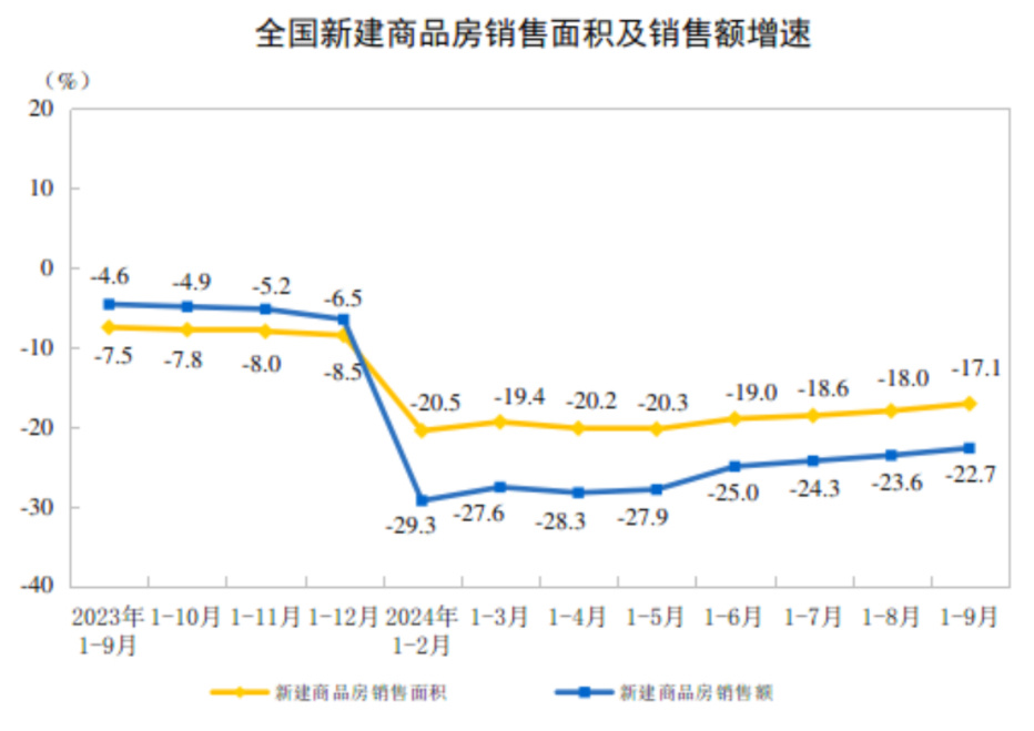 1—9月份,新建商品房销售面积70284万平方米,同比下降17.1%,其中住宅销售面积下降19.2%。新建商品房销售额68880亿元,下降22.7%,其中住宅销售额下降24.0%。