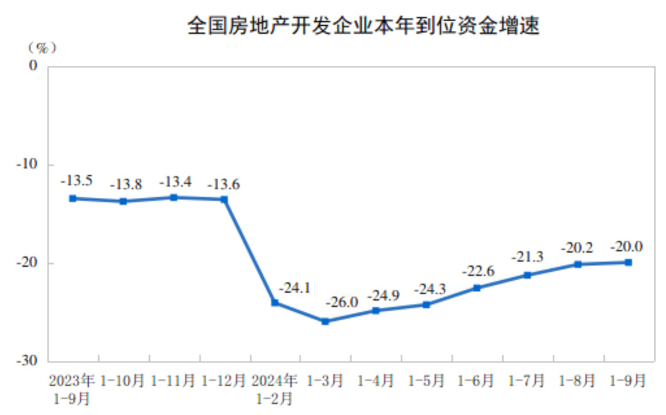 1—9月份,房地产开发企业到位资金78898亿元,同比下降20.0%。其中,国内贷款11466亿元,下降6.2%;利用外资29亿元,下降19.9%;自筹资金28680亿元,下降9.1%;定金及预收款23593亿元,下降29.8%;个人按揭贷款11079亿元,下降34.9%。