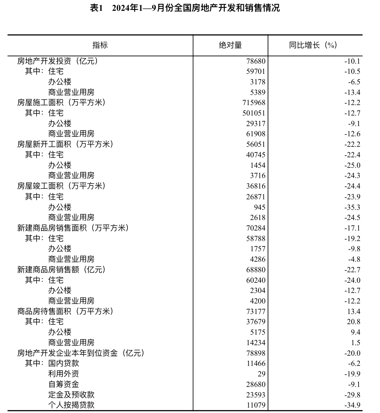 1—9月份,房地产开发企业房屋施工面积715968万平方米,同比下降12.2%。其中,住宅施工面积501051万平方米,下降12.7%。房屋新开工面积56051万平方米,下降22.2%。其中,住宅新开工面积40745万平方米,下降22.4%。房屋竣工面积36816万平方米,下降24.4%。其中,住宅竣工面积26871万平方米,下降23.9%。