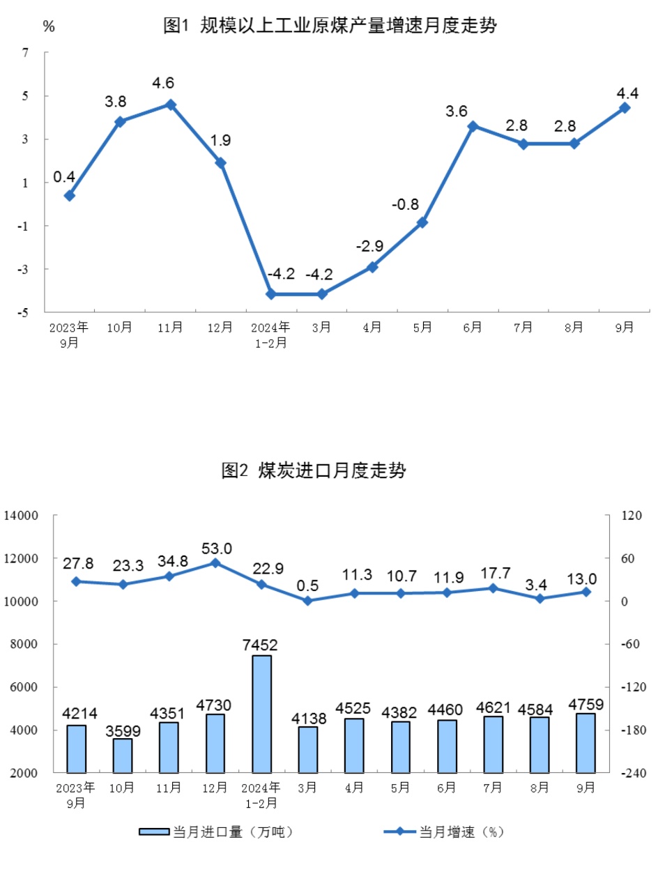 原煤生产增速加快。9月份,规上工业原煤产量4.1亿吨,同比增长4.4%,增速比8月份加快1.6个百分点;日均产量1381.5万吨。进口煤炭4759万吨,同比增长13.0%。