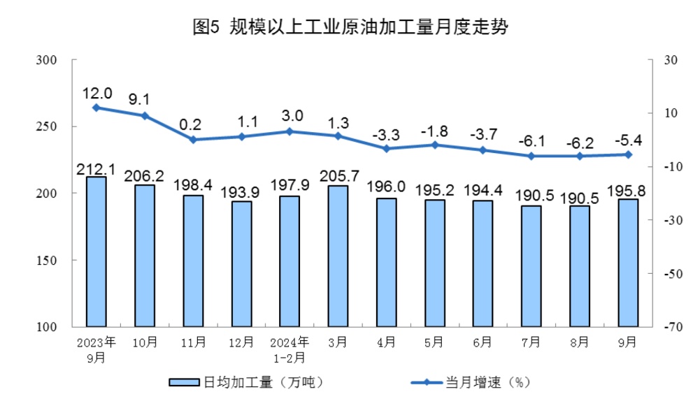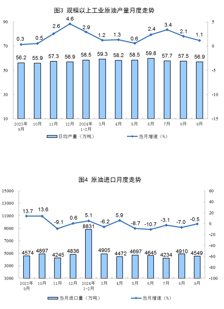 原油生产保持稳定。9月份,规上工业原油产量1707万吨,同比增长1.1%;日均产量56.9万吨。进口原油4549万吨,同比下降0.5%。