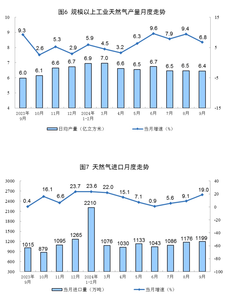 天然气生产稳定增长。9月份,规上工业天然气产量193亿立方米,同比增长6.8%;日均产量6.4亿立方米。进口天然气1199万吨,同比增长19.0%。