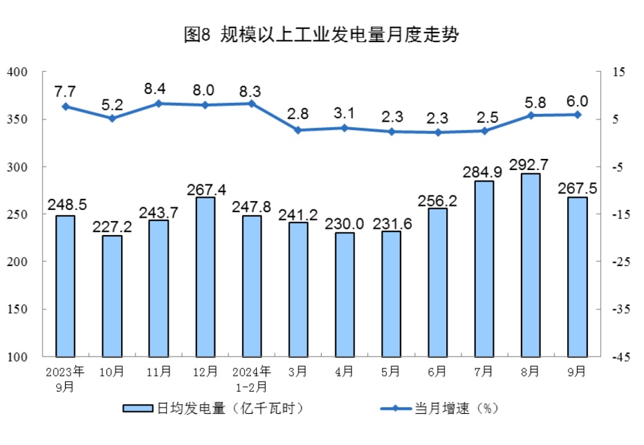 规上工业电力生产有所加快。9月份,规上工业发电量8024亿千瓦时,同比增长6.0%,增速比8月份加快0.2个百分点;规上工业日均发电267.5亿千瓦时。1—9月份,规上工业发电量70560亿千瓦时,同比增长5.4%。