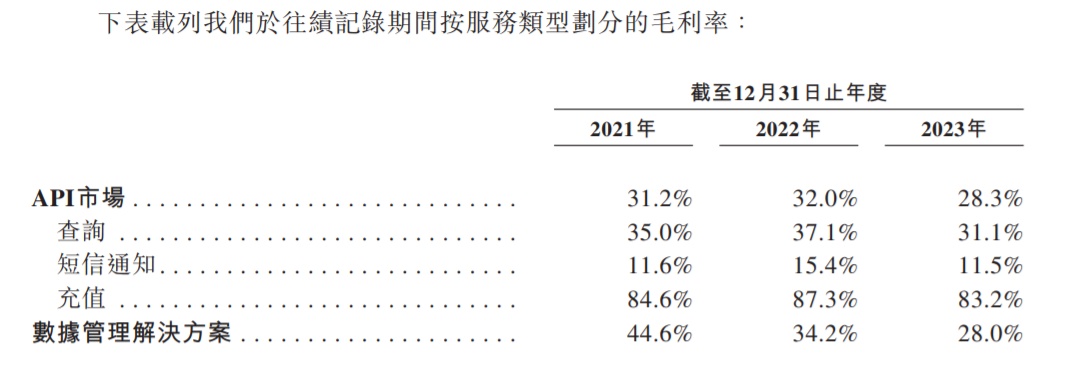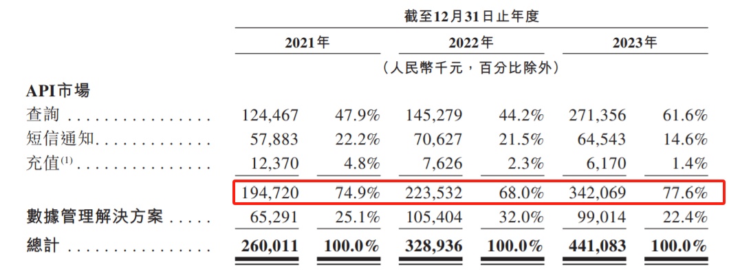 聚合数据的收入主要来自API市场的收入,包括查询、短信通知、充值,及来自数据治理解决方案的收入。其中,API市场收入占大头,2023年时的占比高达77.6%,数据治理解决方案的收入占比为22.4%。