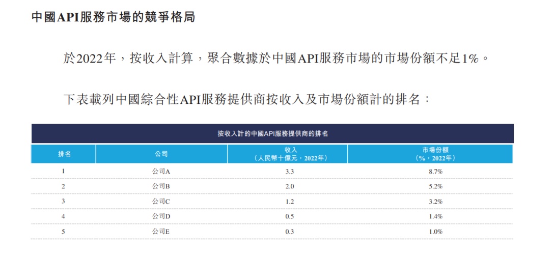 事实上,天聚地合所处的行业是一个竞争剧烈且高度分散的市场。据弗若斯特沙利文数据显示,2022年中国综合性API服务市场前五大玩家的市场份额分别为8.7%、5.2%、3.2%、1.4%、1%,合计不到20%。按2022年的收入计算,天聚地合在中国API市场的份额不足1%。