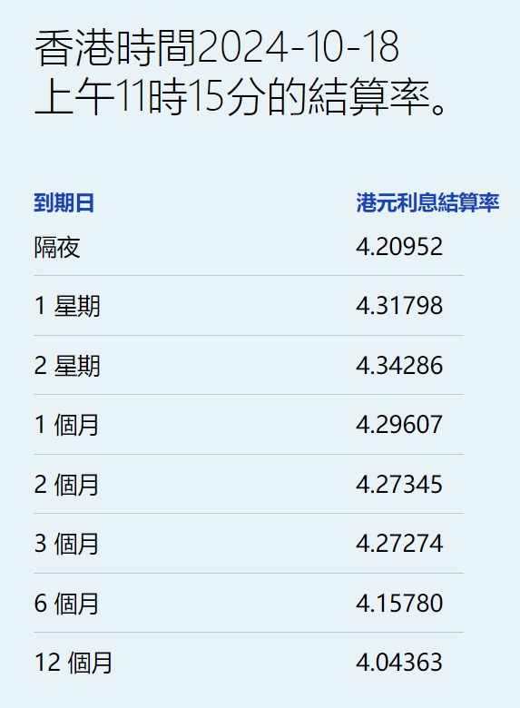 智通财经APP获悉,10月18日,港元三个月以及下各期拆息全线走软,其中,隔夜息连跌四天,报4.20952%,为9月24日以来最低,而与楼按相关的一个月拆息亦三连跌,报4.29607%,为三周新低。