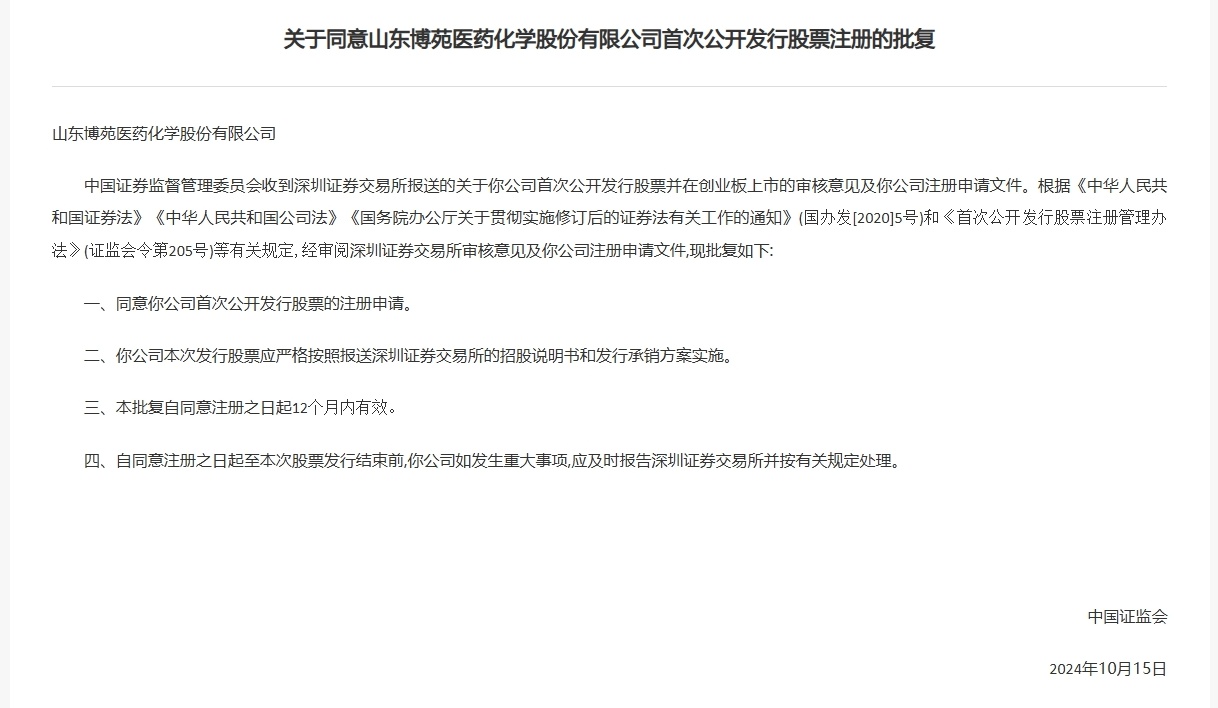 智通财经APP获悉,10月18日,中国证监会发布《关于同意山东博苑医药化学股份有限公司首次公开发行股票注册的批复》。据悉,博苑股份拟在深交所创业板上市,IPO保荐机构为中泰证券,拟募资6.6819亿元。