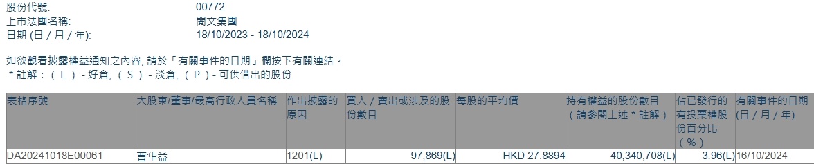 智通财经APP获悉,香港联交所最新资料显示,10月16日,非执行董事曹华益减持阅文集团(00772)9.7869万股,平均每股作价为27.8894港元,总金额约为272.95万港元。减持后最新持股数目约为4034.07万股,最新持股比例为3.96%。