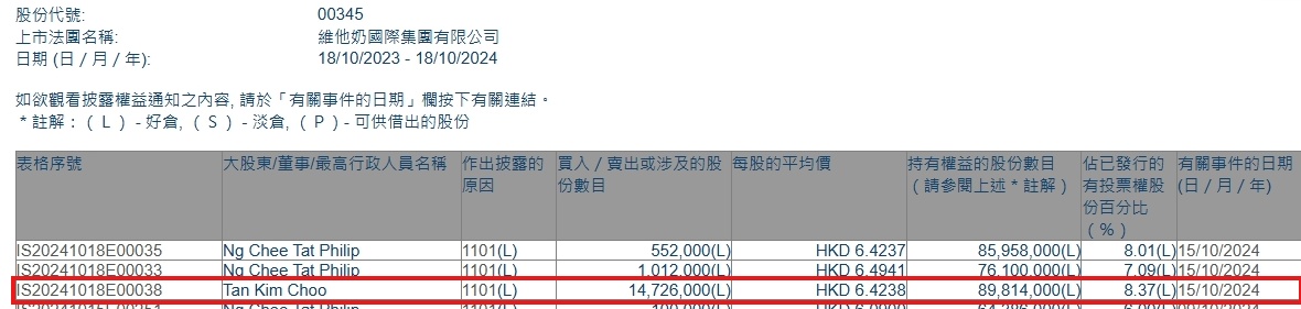 智通财经APP获悉,香港联交所最新资料显示,10月15日,Tan Kim Choo增持维他奶(00345)1472.6万股,每股作价6.4238港元,总金额约为9459.69万港元。增持后最新持股数目为8981.4万股,最新持股比例为8.37%。