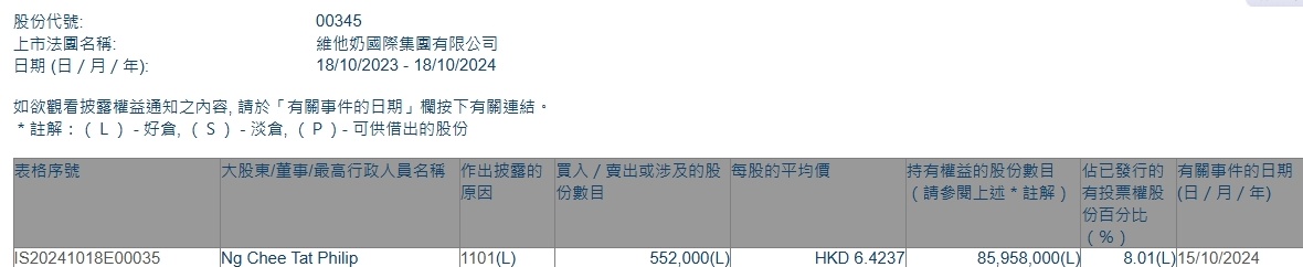智通财经APP获悉,香港联交所最新资料显示,10月15日,Ng Chee Tat Philip增持维他奶(00345)55.2万股,每股作价6.4237港元,总金额约为354.59万港元。增持后最新持股数目为8595.8万股,最新持股比例为8.01%。