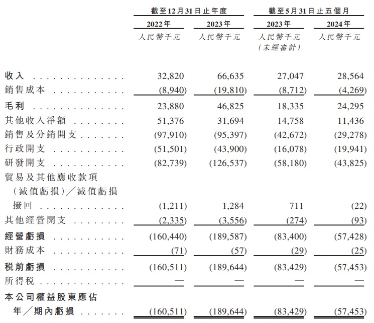 财务方面,于2022年、2023年及2024年截止5月31日止五个月,华昊中天收入分别约为人民币3282万元、6663.5万元、2856.4万元,同期年/期内亏损分别约为1.61亿元、1.90亿元、5745.3万元。