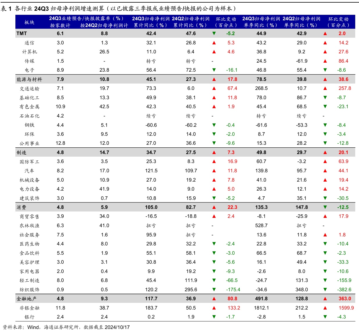 分板块看:制造板块盈利增速小幅改善。24Q3/24Q2制造板块归母净利润达34.7%/27.5%。板块内部行业普遍上涨,主要是有制造出海与设备更新支撑,其中汽车行业利润增速高位上行,龙头个股福耀玻璃、赛轮轮胎、赛力斯盈利表现优秀。TMT板块盈利增速小幅下滑但有结构性亮点。TMT24Q3归母净利润增速为42.4%,相较前值(47.6%)小幅下滑,板块内部有所分化,通信、计算机盈利增速上行,计算机龙头个股浪潮信息24Q3预告净利润增速为65%。金融地产盈利增速改善。24Q3金融地产板块归母净利润累计同比达117.7%,相较24Q2的36.9%显著上升,提升幅度居所有板块之最。其中行业龙头中国人寿、中国人保24Q3预告归母净利润累计同比达547%、75%,主要是受股市表现较好,居民投资意愿强推动。消费板块盈利增速明显上行。消费板块24Q3/24Q2归母净利润累计同比为105.0%/82.7%,但主要是受到农林牧渔扭亏大幅提振,而轻工、社服、纺服则明显拖累。从行业龙头个股看,猪周期或已走出底部,量价齐升推动农林牧渔龙头企业的牧原股份24Q3大幅扭亏。能源与材料板块盈利增速改善。24Q3/24Q2板块整体归母净利润累计同比为45.1%/27.3%,其中交运、钢铁、环保行业的改善幅度较为显著。若从行业龙头个股看,近期地缘政治扰动下船舶绕行带动运输需求提升,推动集装箱航运价格上涨,24Q3中远海运归母净利润增速达73%,较24Q2提升71个百分点。