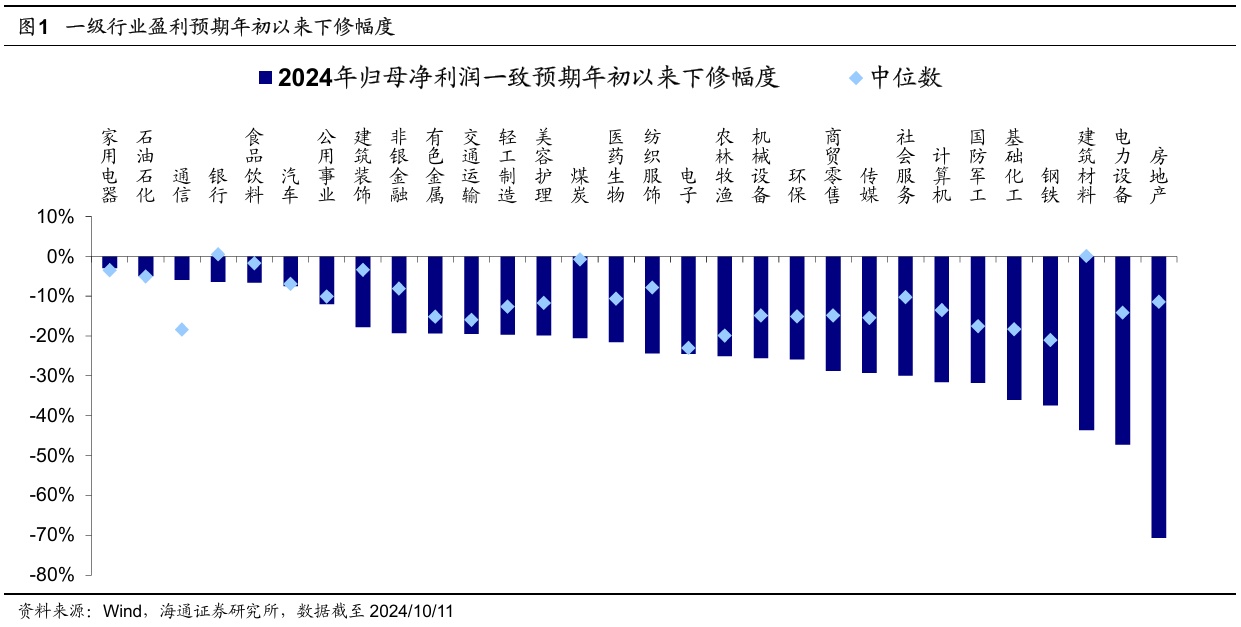 从业绩预期看,通信利润预期下修幅度较小,电子、汽车、家电等行业有一定韧性。前文中我们从上市公司公布业绩预告/预报和三季报角度分析了企业盈利的变化情况,此外分析师对盈利预期的变化也是企业盈利变化的线索。通常分析师在年初对企业盈利普遍较为乐观,而后通常在年内逐步下调盈利预期。这个现象存在季节性规律,因此可以对比每年同期盈利的下修幅度来判断分析师对业绩的预期。我们统计一级行业24年归母净利润一致预期年初以来的下修幅度,对比历年归母净利润一致预期的下修幅度的中位数,辅助判断企业盈利的边际变化。