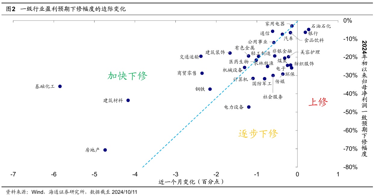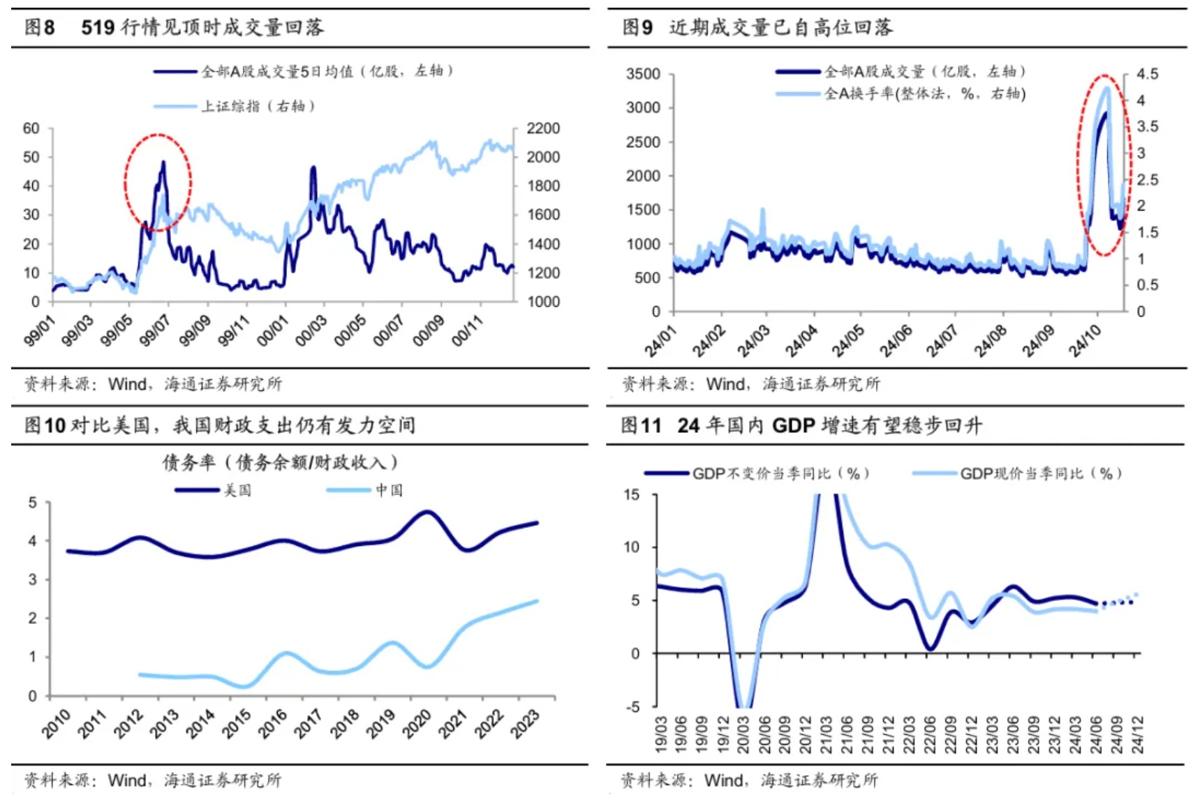 往后看,本轮行情深化升级的关键或在于后续的财政力度。近期政策组合拳频频出台,924新闻发布会、926政治局会议多箭齐发,聚焦实体经济、股市、楼市,其目的或在修复居民资产负债表;10/08发改委新闻发布会,重点围绕“系统落实一揽子增量政策”。10月12日财政部负责人介绍增量财政政策将聚焦化债、地产、民生等方面,包括加大力度支持地方化债、发行特别国债支持国有大型商业银行补充核心一级资本、支持推动房地产市场止跌回稳、加大对重点群体的支持保障力度。10月17日,国新办举办新闻发布会,围绕楼市提出一系列政策,包括允许政策性银行和商业银行向有条件的企业发放贷款并收购房企存量土地、取消普宅和非普宅标准等。10月18日,央行行长潘功胜在2024年金融街论坛年会上指出,已正式启动证券、基金、保险公司互换便利,证监会主席吴清指出,证监会已批复同意20家证券基金公司参与互换便利,首批申请额度已超2000亿元。我们认为,近期的政策聚焦当前市场核心关注点,有望缓解地方政府财政压力、修复居民资产负债表、增加整体消费支出。更为重要的是,财政部负责人表示其他政策工具正在研究中,中央财政还有较大的举债空间和赤字提升空间,增量政策或已箭在弦上。随着财政持续发力,将有助于提振基本面预期,推动实体经济回暖。结合海通宏观预测,24年国内实际GDP同比增速有望达5%左右,落实到微观层面,我们预计24年全A归母净利润同比增速有望达到2%。随着政策发力推动基本面持续修复,本轮股市行情有望进一步深化升级。