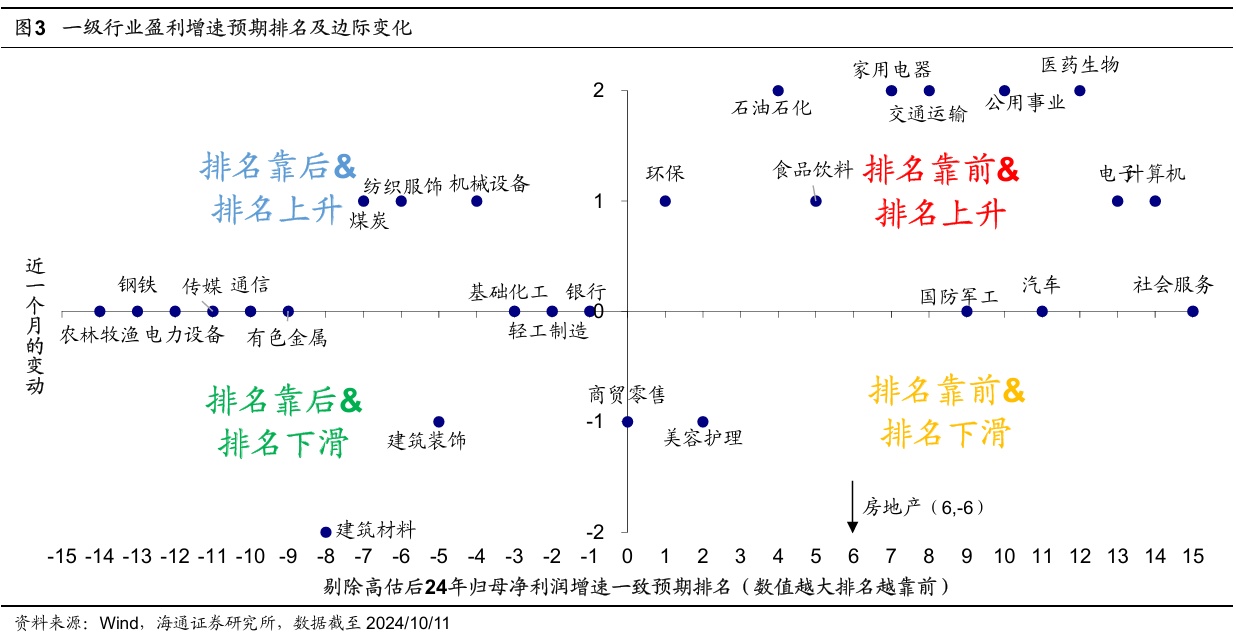 通信盈利预期下修幅度好于历史中位数,家电、汽车、电子盈利预期表现有韧性。大部分行业归母净利润预期年初以来的下修幅度都超过了中位数,反映了今年股市整体业绩承压,但依然有部分行业表现亮眼。例如,通信归母净利润预期年初以来小幅下修5.9%,明显低于历史中位数水平(18.4%),家电(3.0%)、石油石化(4.9%)、汽车(7.5%)、电子(24.5%)下修幅度不大且与历史中位数水平相近,或表明盈利有所改善或持平。边际上石化、银行板块利润一致预期小幅上修,汽车、食饮下修相对缓慢。除了对比盈利预期年初以来的变化,我们还可以从短期的视角,对比近一个月归母净利润一致预期的变化来判断三季报盈利的变化情况。具体来看,石油石化、银行盈利或有好转,近一个月盈利预期小幅上修0.3%、0.2%;食品饮料、汽车近一个月微幅下修0.2%、0.4%但好于市场整体水平。增速上看近一个月医药、公事、家电等预期盈利增速的排名显著提升。除对比一级行业的盈利预期变化程度,此外我们也可以对比各行业归母净利润增速一致预期的排名的变化。具体来看,医药综合表现较优,截至24/10/11在一级行业中排名第4且较一个月前排名上升2名,公事(第6)、交运(第8)、家电(第9)、石化(第12)近一个月也有2名的升幅。