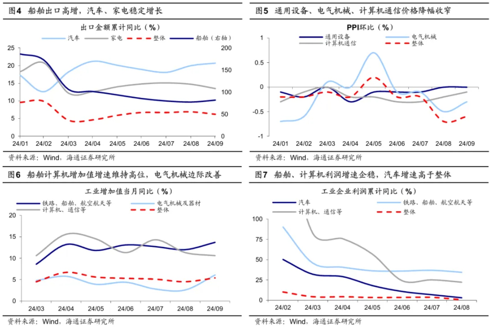 首先,从出口数据来看,船舶、汽车、家电三季度表现亮眼。船舶1-9月出口金额累计同比达81.6%,此外汽车、家电三季度出口增长也较高,1-9月出口金额累计同比为20.7%、13.5%,高于整体出口水平(6.2%);从出口数量上看,汽车、船舶三季度出口增速居前。我国主要出口商品中,混动客车(911.9%)、非插电混动乘用车(377.2%)和插电混动乘用车(13.75%)出口数量累计同比居前,船舶中的集装箱船(100.0%)、散货船(88.4%)和液货船(66.3%)也表现较好。其次,通用设备、电气机械、计算机通信PPI环比降幅收窄。下半年价格整体收缩,PPI环比持续下滑,但从结构上看机械、计算机仍表现优秀。通用设备(0.0%)、计算机通信(-0.1%)9月PPI环比改善,高于整体环比增速-0.6%;电气机械9月份PPI环比为-0.3%,降幅也有所收窄。装备制造价格涨跌互现,其中电力电子元器件制造价格涨1.8%,工业机器人制造价格涨0.6%。收入端看,计算机、船舶三季度工业增加值增速维持高位。船舶9月工业增加值增长13.7%,较7月上行1.7个百分点,电气机械9月工业增加值为6.1%,高于整体5.4%的增长且较8月提升4个百分点。从主要产品产量来看,新能源汽车、风电、光伏电池的产量增速有明显提升,工业机器人、集成电路的增速则保持高位,新质生产力表现亮眼。利润方面,船舶、计算机、汽车三季度维持高增速。24年1-8月规模及以上工业企业利润累计同比为0.5%,较前值(3.6%)明显回落,但分结构看船舶(34.5%)、计算机(22.1%)、汽车(3.0%)8月利润增速仍然较高,较6月份基本持平并且好于整体水平(0.5%)。