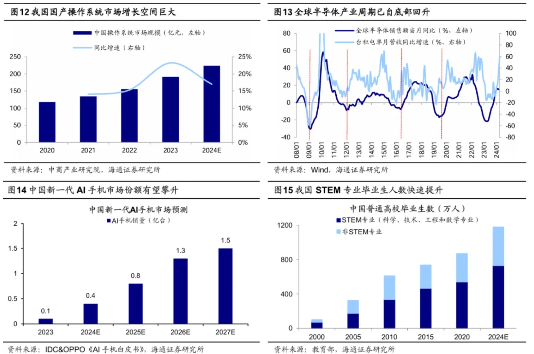第一,科技制造方面,产业周期向上叠加中短期事件催化下,科技领域或演绎主线行情。从长周期视角看,当前科技产业正处在新一轮向上大周期中,以人工智能为代表的新一代信息技术正在各个领域加快落地,或将在未来深刻改变人们生产生活方式。中短期看,科技产品创新和政策支持正共同推动科技行情演绎:技术产品端看,10/11特斯拉发布Robotaxi产品,推出无人驾驶出租车,未来自动驾驶或将加快落地覆盖更多场景;政策端看,近期各地信创加速推进,例如9月18日福建省发改委公布规模约4600万的电子政务新创规模,根据国资委,到2027年央国企将完成100%信创替代,未来财政发力背景下信创有望提速。政策利好和技术创新双重驱动下,未来科技相关领域有望进一步受益,具体细分领域中可关注以下领域:一是信创提速背景下国产操作系统增长空间较大,目前我国操作系统国产化率仍不足5%,预计24年国产操作系统市场同比增速达17%。二是AI浪潮带动半导体周期回升。AI技术的性能推进对关键半导体元件的需求具备促进作用,目前全球半导体周期已处在明显回升中。三是技术突破下人形机器人应用或将加速,制造业对于人形机器人的远期需求较大,随着劳动力成本上升,未来对于机器人处理危险工作的需求或将持续增长。