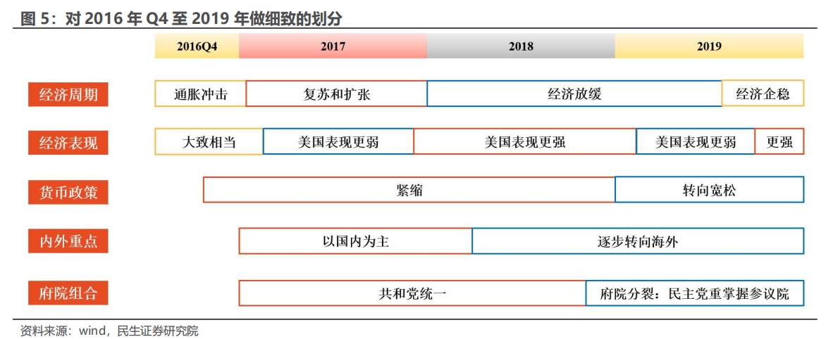 基于以上维度,我们把2016Q4至2019年分成五个部分,可以作为今年美国大选结果不同情景的参考: