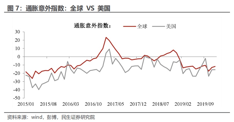 经济相对表现上,尽管美国经济的周期韧性更强,但是基本面的相对表现上仍有差异。如图8所示,2017年大部分时间内,在全球共振复苏的背景下,美国经济数据的表现要弱于全球;2018年则相反,全球经济放缓下,美国的表现更好;2019年则强弱参半,上半年美国偏弱,下半年美国经济弹性复苏。