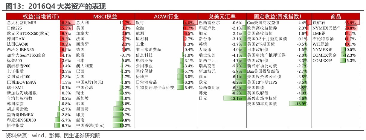 政策和政治上,特朗普意外当选,扩张性政策预期升温;此外欧洲风险上升,意大利举行宪法公投,引发市场对欧盟解体和银行危机的担忧。