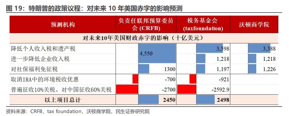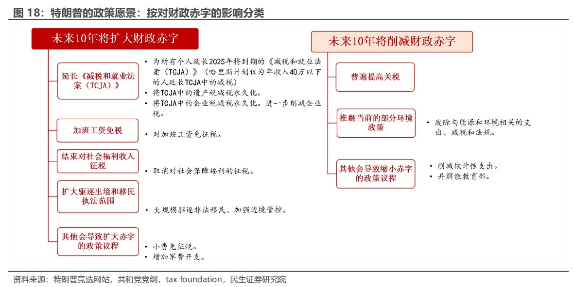 从财政的视角,如果出现“共和党横扫”的情景下,随着赤字扩大,“再通胀”的概率上升。特朗普大概率会在2025年优先推动减税法案,将刺激内需、给CPI造成较大上行压力;大规模驱逐移民和加征关税则会从供应端推升通胀。