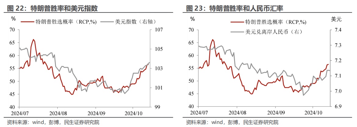 市场已经开始为特朗普重回白宫交“定金”了。9月底以来随着特朗普支持率的持续攀升,市场开始押注了,其中美元指数的大幅升值被视为代表,背后可能更多的是对特朗普政策再通胀内核和地缘“冲击”带来的担忧,对于贸易摩擦的定价并不多。