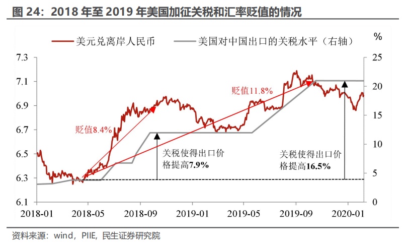 市场承认再通胀风险,但可能并不是很在意关税。从灵敏的汇率市场来看,美元的升值以及人民币的贬值一定程度上反映市场对特朗普政策背后再通胀的风险以及地缘的紧张,但对于特朗普宣扬的关税内容(全球10%关税,中国60%关税),定价是远远不足,以2018年至2019年为例,人民币相对美元的贬值幅度和关税提升对出口价格的静态影响大致相当,而当前人民币汇率的变动幅度与特朗普设想的关税场景,相差甚远。