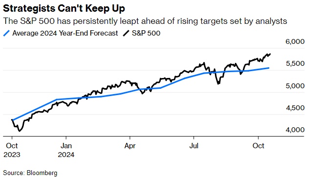 股市的强劲往往会对经济产生正反馈循环。随着标普500指数的上涨,人们对未来12个月美国经济将继续增长的乐观情绪有所增强。所有这些都与市场越来越相信唐纳德•特朗普将重新入主白宫的观点一致。特朗普赢得美国大选被认为利好股市,不利于债券。