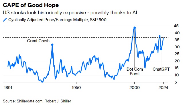 随着盈利能力和生产率的增长,CAPE会随着时间的推移而上升。但令人不安的是,标普指数比1929年大崩盘前夕还要贵,比2000年初互联网泡沫破裂时便宜不了多少。或许更重要的是,CAPE在过去创下高峰后,将在几年内急剧下降。这一次并非如此,CAPE在2021年疫情后的繁荣时期达到峰值,但在2022年底反弹。不管是否巧合,这次反弹恰好与ChatGPT的推出时间一致。人工智能热潮似乎在保持市场高位方面发挥关键作用。